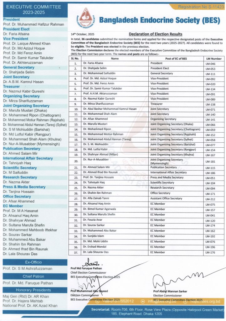 October 14, 2025 Declaration of Executive Committee of BES! The Election Commission for the BES Executive Committee declares the names of elected Executive Committee members for the next two years. The complete committee [2025-2027] is attached herewith:-