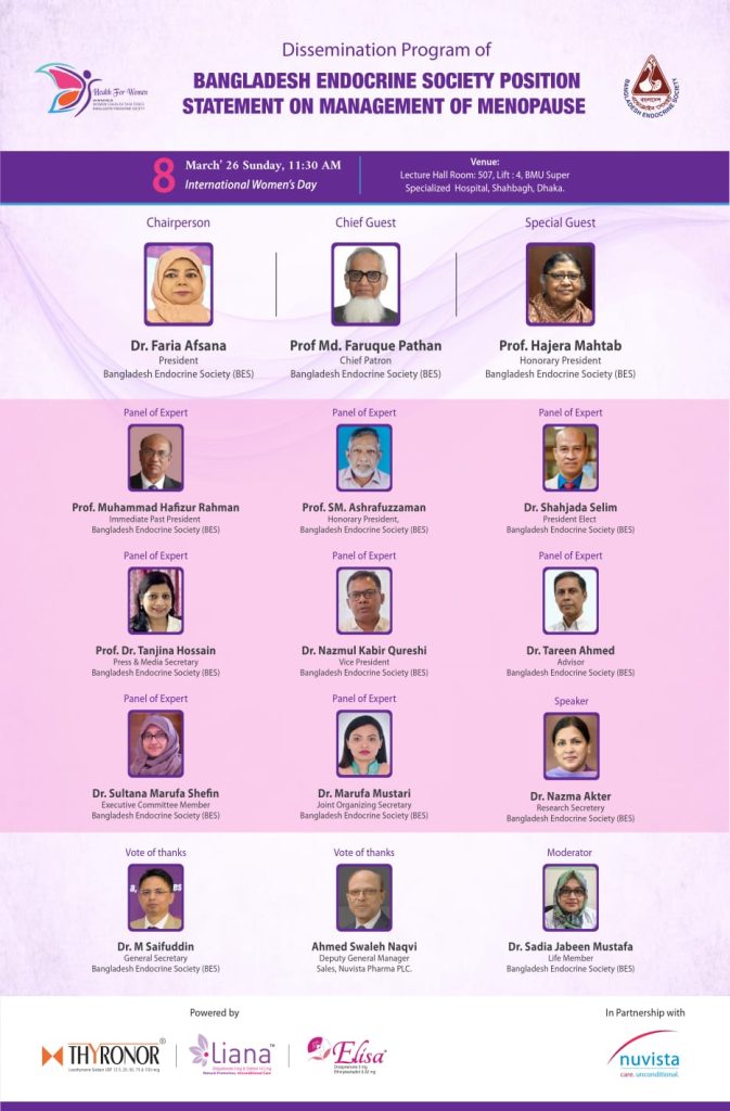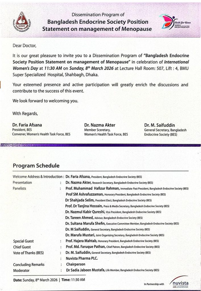 It is our great pleasure to invite you to a Dissemination Program of “Bangladesh Endocrine Society Position Statement on management of Menopause” in celebration of International Women’s Day on Sunday, 8th March-2026 at 11:30 AM at Lecture Hall Room: 507, Lift: 4, BMU Super Specialized Hospital, Shahbagh, Dhaka.